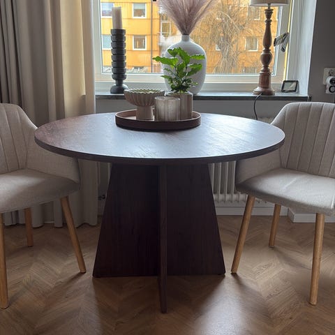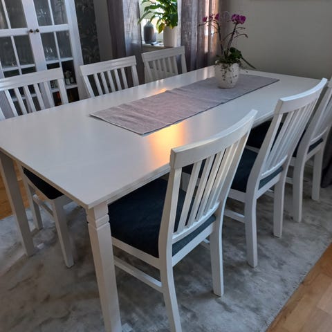 Harry matbord Mio 115-160 cm, nypris 5 595 kr. Fyra stolar från Ellos, Venture Home, nypris 2 700 kr (på kampanj). Allt inköpt januari 2025, säljes pga flytt. Mkt lite använt! Pris 5 500 kr eller högre bud. Katt finns i hemmet.