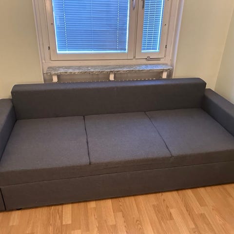 Bäddsoffa friheten 3- sits från IKEA, beige klädsel. Fint skick men har några fläckar på. Avtagbar klädsel på kuddarna, går att tvätta.