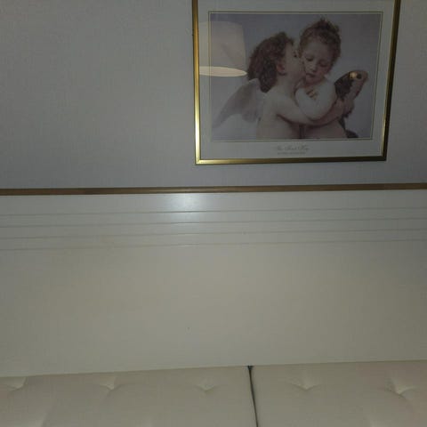 Vit sänggavel i trä.