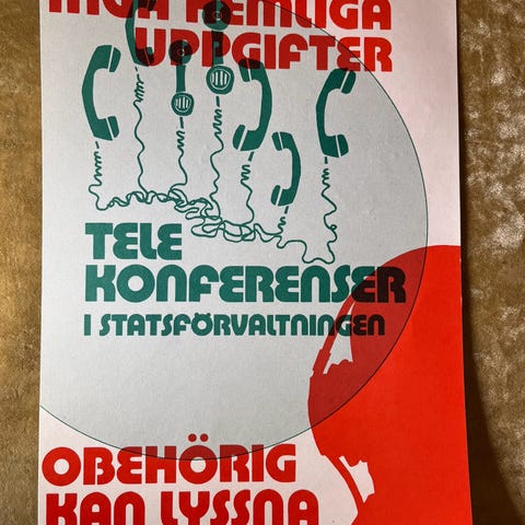 Informationsaffisch med texten "Många telefonsamtal går på radiolänk... Var rädd om orden! Signalsapning pågår". Affischen har en grön och svart färgskala med bilder av personer och en telefon. Affischen är avsedd för informations- och varningsändamål.