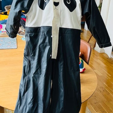 🌸 Svart/turkos fleecefodrad regnoverall strl.130. En liten reva på ena bakbenet som blivit lagat. Avtagbar luva.