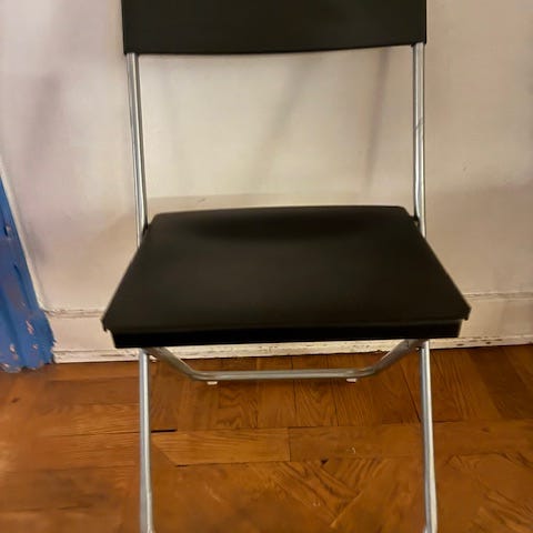 Tre klappstolar med sits i rotting.