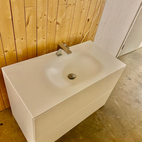 Handfat i porslin och underskåp med lådor, märke Ifö.