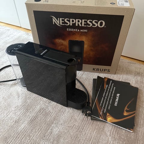 Nespresso Essenza Mini espressomaskin i svart färg. Kompakt design lämpad för att brygga espresso med Nespresso-kapslar. Maskinen är enkel att använda och passar för hemmabruk.