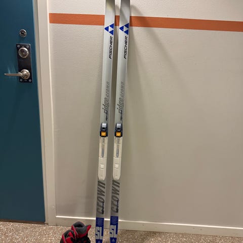 Längdskidor Atomic vallningsfria med räfflad yta 150 cm, lämpligt för barn med längd 130-140 cm.