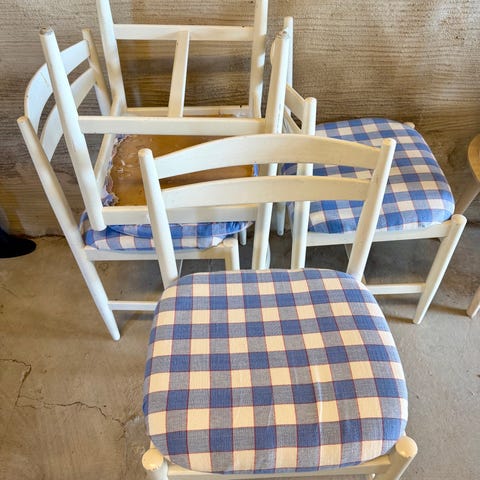 4 starka stolar ommålade i vit med 4 dynor i bra skick från Ikea för 200 kronor.