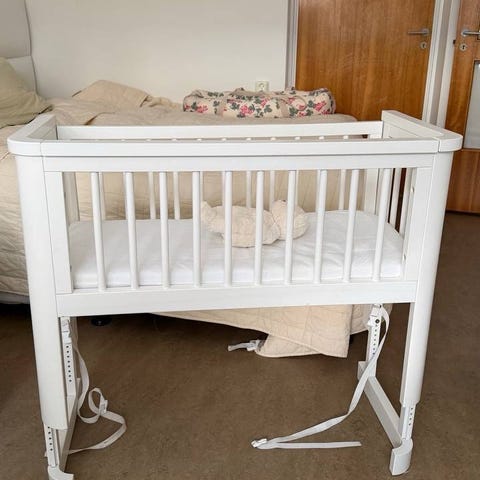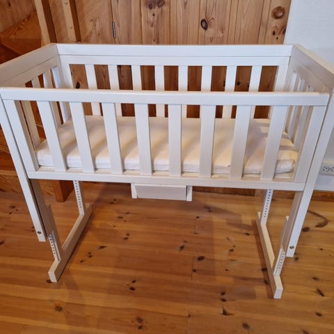 Ena spjälsidan saknas, då vi endast använts sängen som Bedside crib mot vuxensängen, dvs inte som fristående. Så säljs som på bilderna.