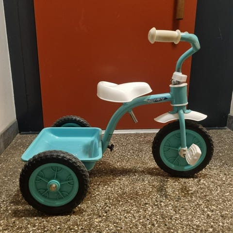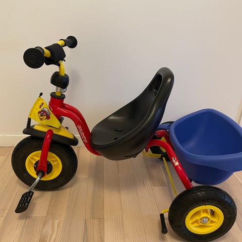 Barnbil i form av en röd trehjuling med svart sits. Leksaken är avsedd för barn och har en stabil konstruktion för lek och rörelse.