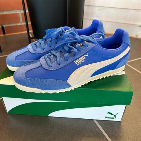 Originalkvitto finns kvar och medföljer. Extra skosnören följer också med – ett lila par och ett grönt par som enkelt kan bytas på skorna (original).