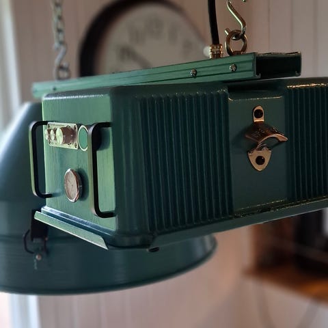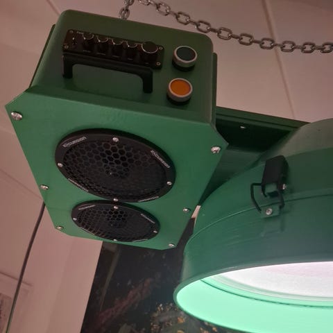 Industriell taklampa i gul färg med integrerad ljudanläggning. Lampan är tillverkad i metall och designad för takmontering med kedja, Förstärkaren har flera knappar och vred för justering av ljud samt är anslutningsbar via blåtand. Själva ljuskällan är av varumärket Plejd och kan styras via app på telefonen, på en knapp på lampan eller via den trådlösa vriddimmern som med följer. Mycket bra ljud och ljus. Ett riktigt kvalitets bygge och en unik inrednings detalj som sticker ut. Hör gärna av er om ni har några funderingar eller om ni vill komma och titta/testa den. Mvh Jocke.S