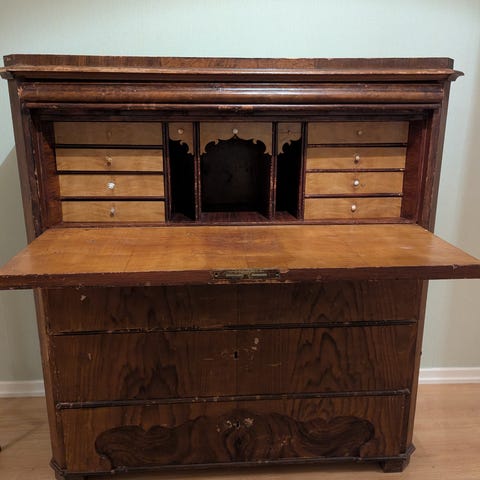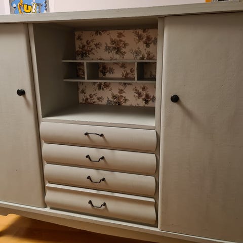 Träskåp med två skjutdörrar i glas. 1950 enligt datering på baksida. Helt okej skick, slitits med tiden men inga större fel.
