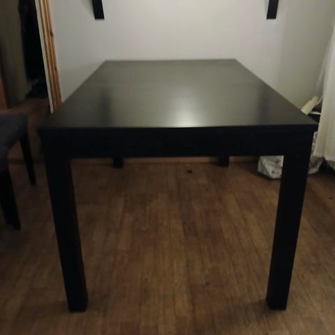 Stort matbord 240x105cm, typ 40mm tjock skiva. Har torkat isär lite i ena ändan på bordet, en duktig snickeriarbetare fixar det nog. Riktigt stabilt och tungt. 8 Stolar med mjuk sits i fejkläder. Lite färgfläckar här å där från pysslande barn, går bort med vatten och gnugg.
