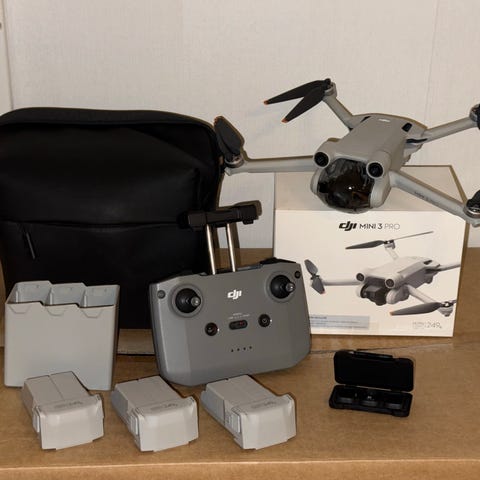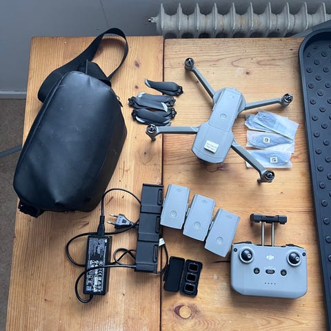 DJI Mavic 2 Pro drönare inklusive fjärrkontroll, batterier, laddare, väska och extra propellrar. Tillbehör enligt bild. Batterier laddades 25,26 och 29 gånger. Väldigt sparsamt använd.