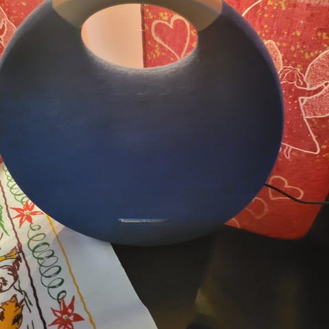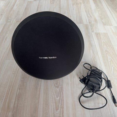 Harman Kardon högtalare med rund design och svart tygöverdrag, medföljd laddare. Studio 3 modell, funkar som ny med bra ljud och bas.