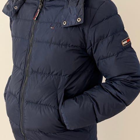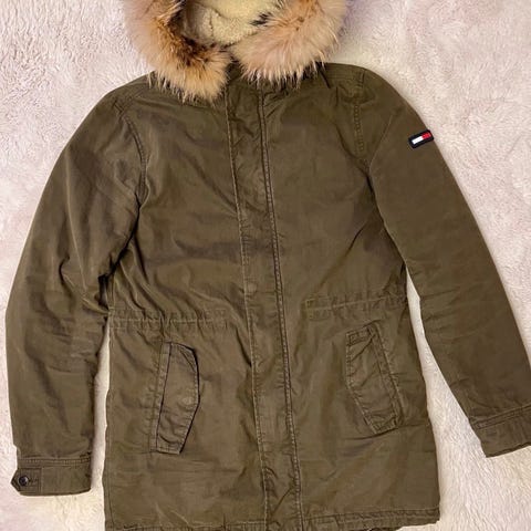 Tommy Hilfiger vinterjacka i storlek L och grön färg. Jackan är avsedd för män.. Den har en vadderad konstruktion för värmeisolering och en huva för extra skydd mot väder. Avtagbar skinnkrage