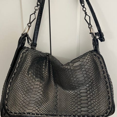 Svart och grå kanvas i spets, skinnhandtag och skinndetaljer. Ca 37 cm lång