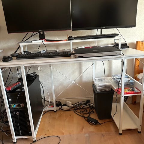 2 st arbetsbord (vita) - Består av två stora vita bordsskivor och 8 st tillhörande ben i silverfärgad metall. Eftersom benen är löstagbara är borden mycket enkla att transportera och förvara platt mot en vägg när de inte används. Mått LxDxH 150x75x70cm