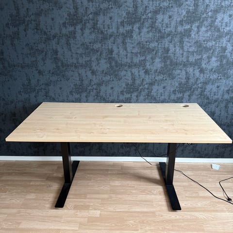 Skrivbord gott som nytt, finns en plats för kablarna under så att de inte rörs om kring, du kan höja skrivbordet och sänka om du känner för de men måste dock göras egenom benen, skrivbord är L format och väldigt stort med mycket yta att placera föremål, 160 cm längd och 110cm på bredden som sticker ut! för mer information skriv i chatten