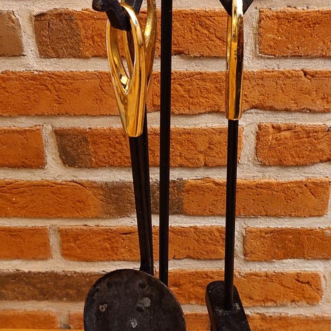 - Klassiskt set med eldstadsset / kaminverktyg i svart smidesstil (mått ca. 77x25x25cm) med vackra vridna detaljer på handtagen. Består av stativ samt fyra verktyg: