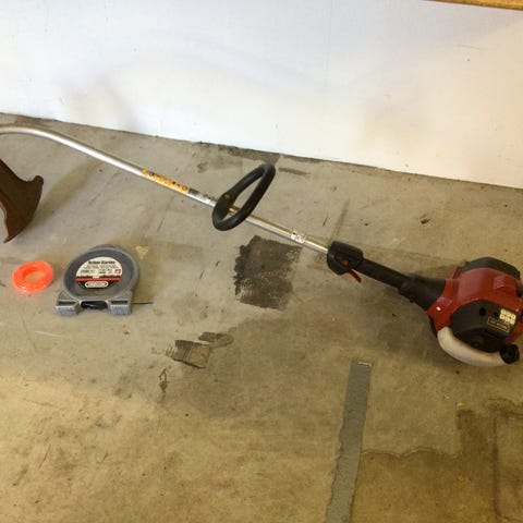 Mecc grästrimmer med bensinmotor. Utrustad med handtag och justerbar stång för gräsklippning i trädgårdar och mindre områden.
