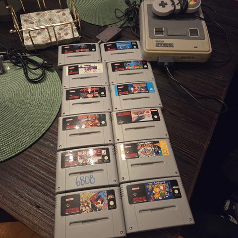 Med en handkontroll, spelen Super Mario All Stars och Mario World på samma kasett, samt Donkey Kong.