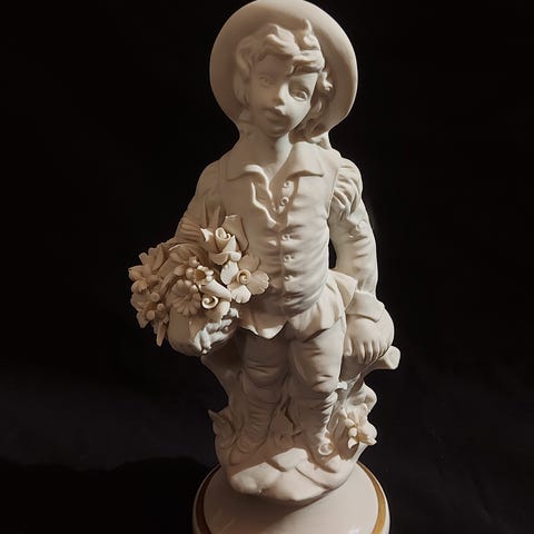 Handgjord Marcolin Capodimonte porslinsfigur i mat vit biscuit-porslin. Tillverkad i Italien ca 1985–1995 (vintage). Detaljerad blomsterdekor, klassisk italiensk design. Höjd ca 15–16 cm. Mycket fint skick, inga sprickor eller lagningar