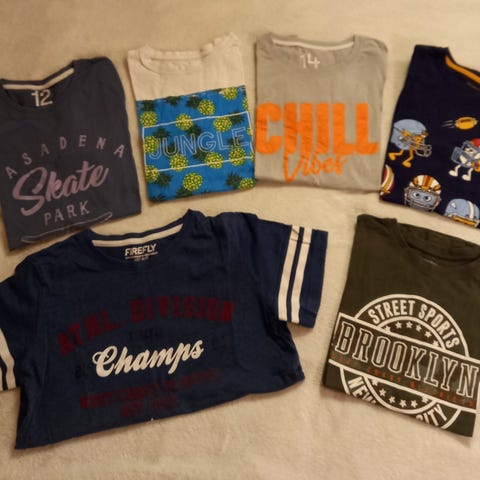 Tre t-shirts med tryck. En mörkblå med ett tryck av en skateboardåkare och texten "URBAN CITY". En lila t-shirt med döskallar och texten "NUMB SKULL EPIC". En ljusgrön t-shirt med ett tryck av en tecknad figur som håller en pizza och texten "Eliah's PIZZA PARLOR".