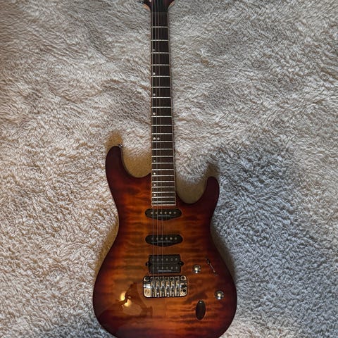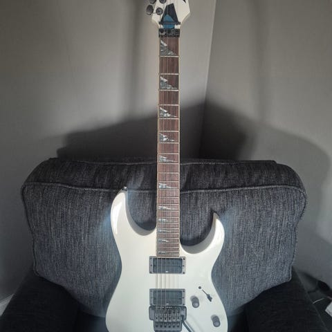 Ibanez gio elgitarr i vit färg med sex strängar och tremolo-system. Gitarren har en en lönn-hals med rosenträ greppbräda. Utrustad med tre pickuper (två single-coil och en humbucker) samt justerbara volym- och tonkontroller. Även nya strängar sen ca 2 veckor sedan. Gitarren är i fint skick med några få slitage