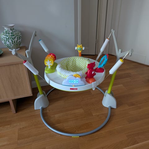 Sittdelen kan rotera i 360 grader så att ditt barn kan utforska sin omgivning. Det lysande molnet räknar ditt barns hopp, spelar musik och har fyra ljudeffekter. De interaktiva leksakerna placeras runt kanten och uppmuntrar till utveckling och ger en lärande lekstund. När lekstunden är över fäller du enkelt ihop hoppgungan för smidig förvaring.