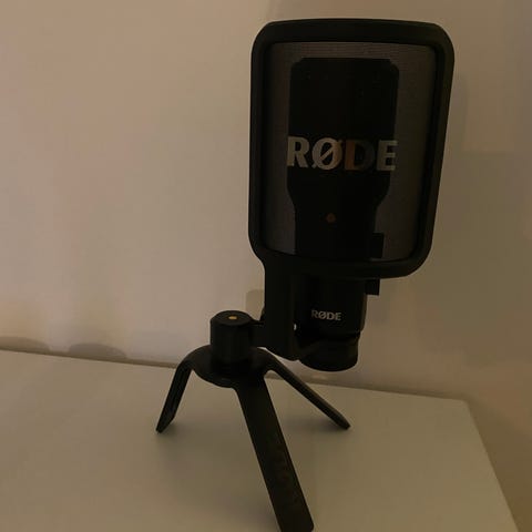RØDE NT-USB USB-mikrofon i svart färg. Mikrofonen levereras med stativ och popfilter. Den är avsedd för professionell ljudinspelning och ansluts via USB.