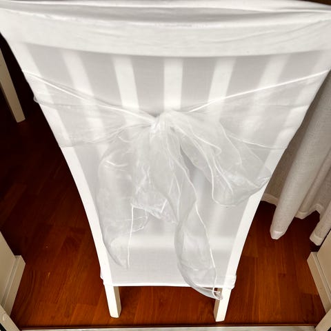 Stolsöverdrag i vit textil. Överdraget är utformat för att täcka hela stolen, inklusive ryggstöd och ben, och ger ett enhetligt uttryck. Passar exempelvis till evenemang, fest eller konferens. Standard storlek. Materialet är tyg av bra kvalité. Finns Flera styckna. Priset är angivet per styck.