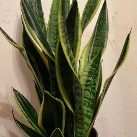 Sansevieria växt i kruka med gröna, upprätta blad med mönster. Lämplig som inomhusväxt och kräver minimal skötsel.