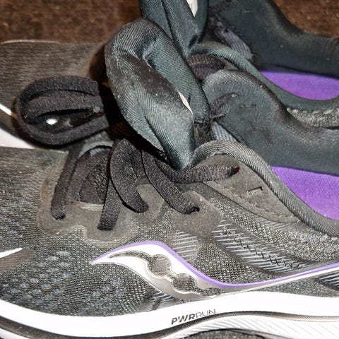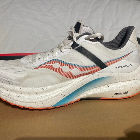Saucony löpning skor i storlek 42, vita med orange och blå detaljer. Skorna är designade för löpning och har en mesh-överdel för andningsförmåga och en dämpad sula för komfort under träning.