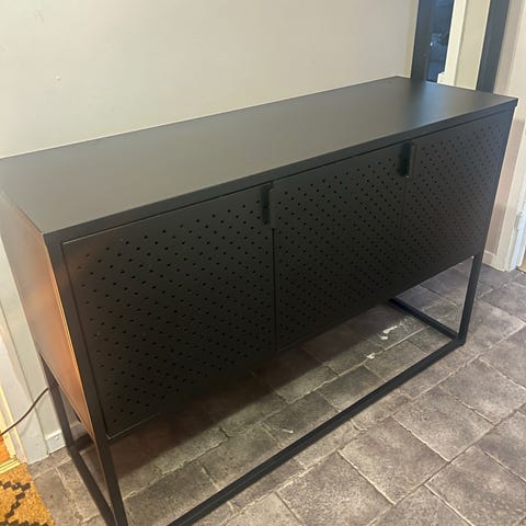 En sideboard från Ikea (Hemnes) i vitt trä. Två skåp och tre rymmliga lådor. En liten skavank på vänster hörn, se sista bilden.