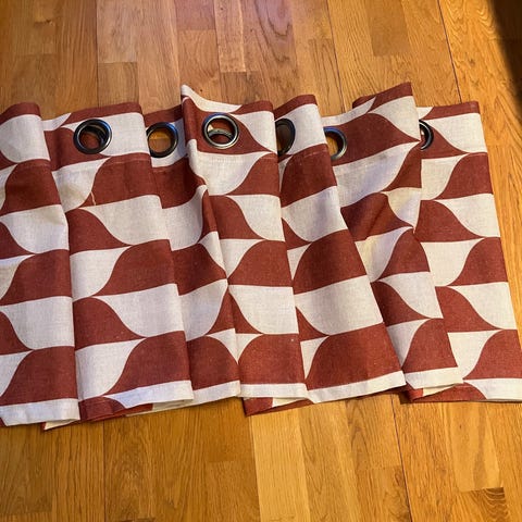 Vilken pärla! Vilket mönster och vilka färger! 60-talet när det är som bäst. En gardinlängd designad av Saini Salonen för Borås. Mönstret heter Lago. Ca 114 cm bred och ca 215 cm lång plus ca 11 cm upplägg. I fint begagnat skick. Några fläckar efter upphängningen på den vita delen på baksidan. Se bilder och hör av dig om du har frågor. Jag packar väl men ansvarar inte för transportörens slarv. Se gärna mina övriga annonser.