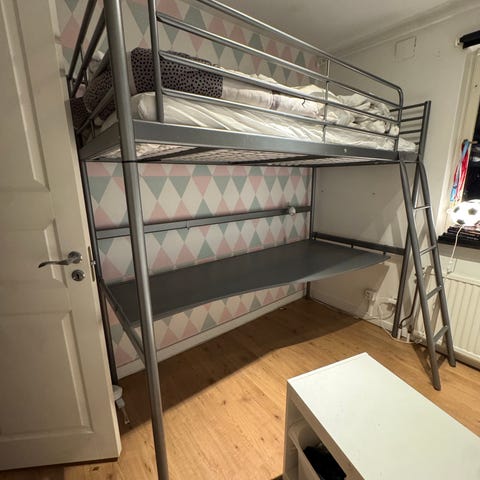 Sängen är i bra skick förrutom skrivbordsskivan som har repor och missfärgningar (kolla bilden) från pysslande. Ett lager vit färg så blir den som ny! (för den händige) Vi har försökt göra ren den så gott vi kan.