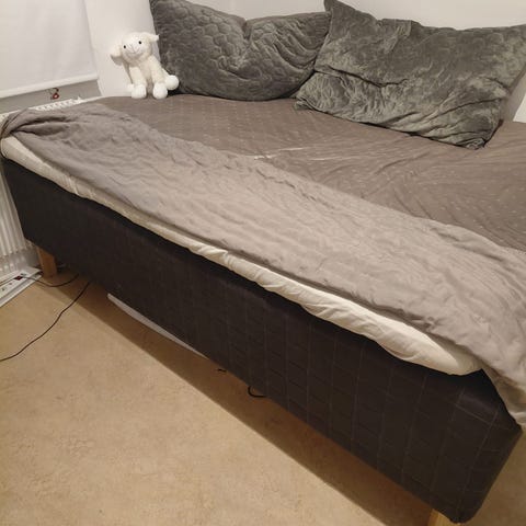 Säljer 140 säng från IKEA, grått omslag och träben. Fint skick och kan säljas med eller utan bäddmadrass. Finns plats för förvaring under sängen.
