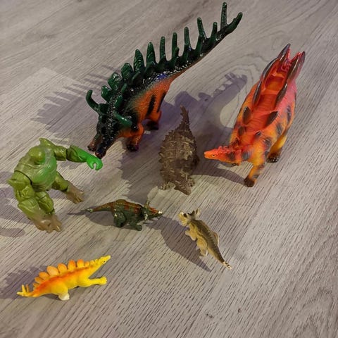 Papo Tyrannosaurus och spindel leksaksfigurer i plast. Tyrannosaurus är märkt med "Made in China" och årsangivelse 1992, medan spindeln är märkt med "Made in France" och årsangivelse 2016. Figuren är detaljerade och målade i färger som brunt, blått och svart.