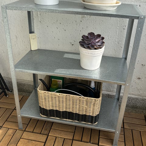 Grå meal skohylla med måtten 90 cm i längd. Hyllan har en enkel design med ribbad sitt- och förvaringsyta och är lämplig för inomhusbruk.