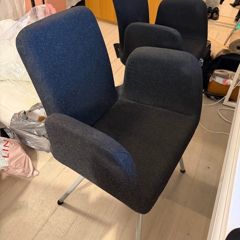 Säljer nu 5 st av IKEAs klassiska "Patrik" konferensstolar/karmstolar i mörkgrått tyg med snygga silverfärgade ben.