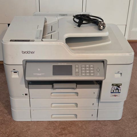 Multifunktionell enhet med utskrifts-, skannings- och kopieringsfunktioner. Kompakt design lämpad för hemmabruk eller mindre kontor.