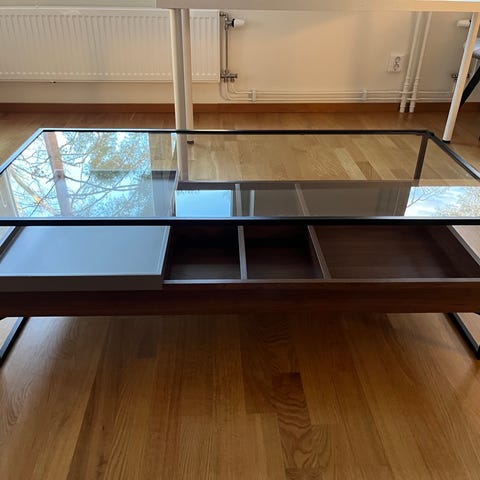 Säljer mitt soffbord köpt från Tumba Möbler samt matchande sidobord från Jotex. Borden har en glasskiva med svarta metallben, se bilder för mer detaljer.