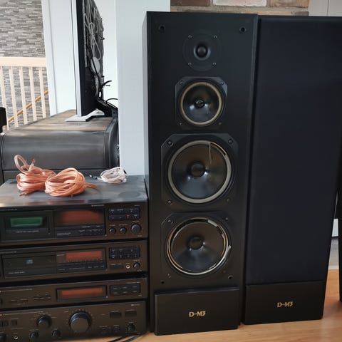 Sharp stereopaket bestående av flera enheter för ljudåtergivning. Utrustningen är avsedd för ljuduppspelning i hemmet eller liknande miljöer. Ingår även LP-spelare och högtalare.
