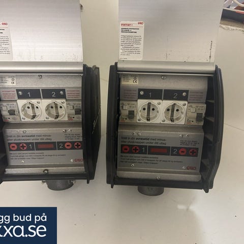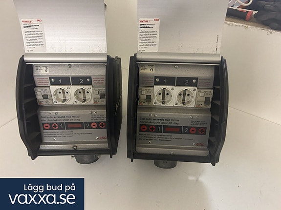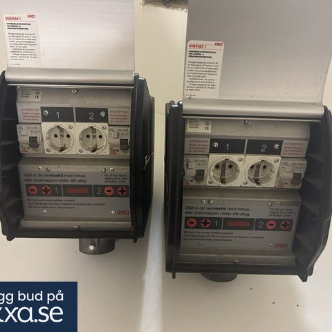 Kapslade eluttag från GARO med inbyggd tidsstyrning. Varje enhet är utrustad med två 230 V-uttag samt separat tidsinställning per uttag. Avresetid ställs enkelt in med plus- och minusknappar och ger möjlighet till tidsbegränsad drift alternativt direkt tillslag.