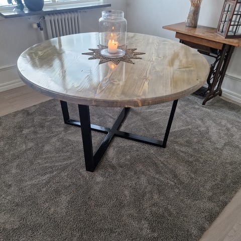 Robust matsalsbord från SIA i vintage/industriell stil med svart/brun järnram och kraftiga metallben. Bordsskiva i massiva träplankor med naturlig patina och skavanker efter familjeanvändning – kan slipas och behandlas för nytt uttryck. Stabilt och rymligt bord med mycket karaktär.