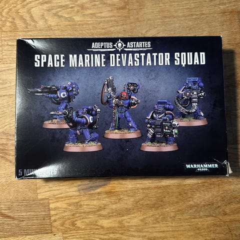Denna box innehåller 5 Space Marine Devastators armed, i plast.