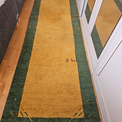 Svartvitmönstrad ullmatta från Gan-Rugs köpt på Nordiska Galleriet. 100% ull, handgjord i Spanien.