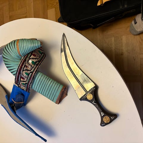 sannolikt dekorativa orientaliska dolkar eller brevöppnare, snarare än funktionella vapen. Liknande föremål säljs ofta som souvenirer och beskrivs som "turkiska" eller "arabiska" i stilen, ibland som replikor från Spanien eller andra platser.