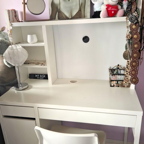 Skrivbord i ljust trä med en övre hylla och en stång under skrivbordsskivan. Skrivbordet är lämpligt för hemmakontor eller studier. Materialet är trä och färgen är ljus.
