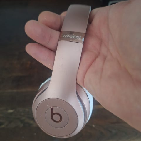 Beats hörlurar i rosa och vitt. Trådlös design med vadderade öronkåpor för komfort vid användning.